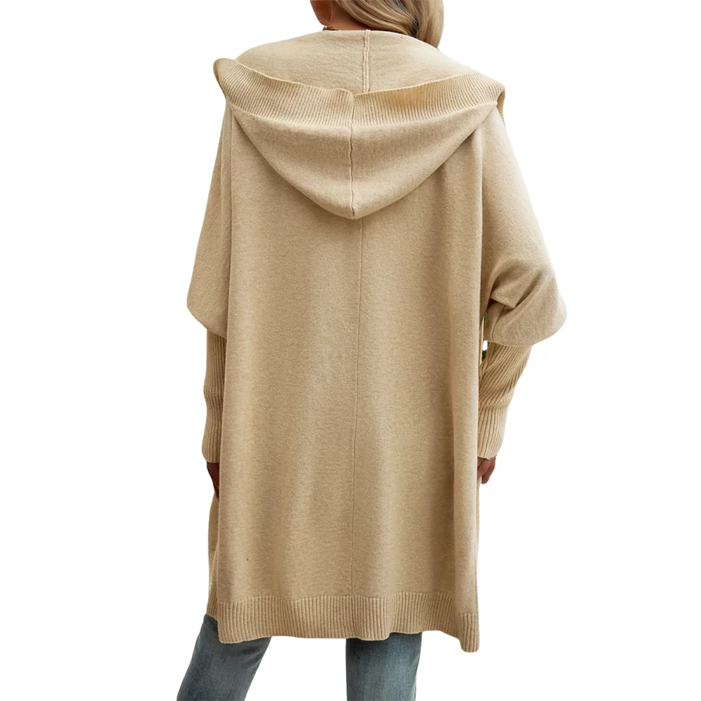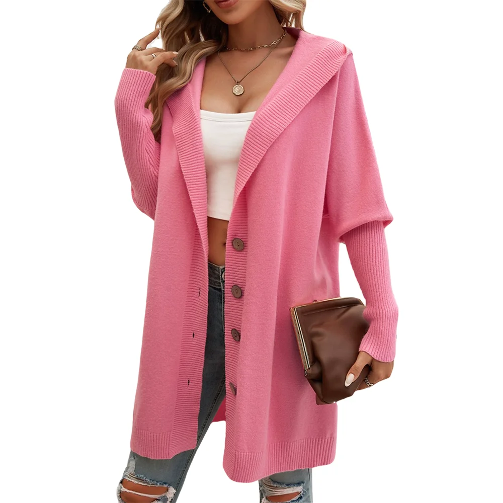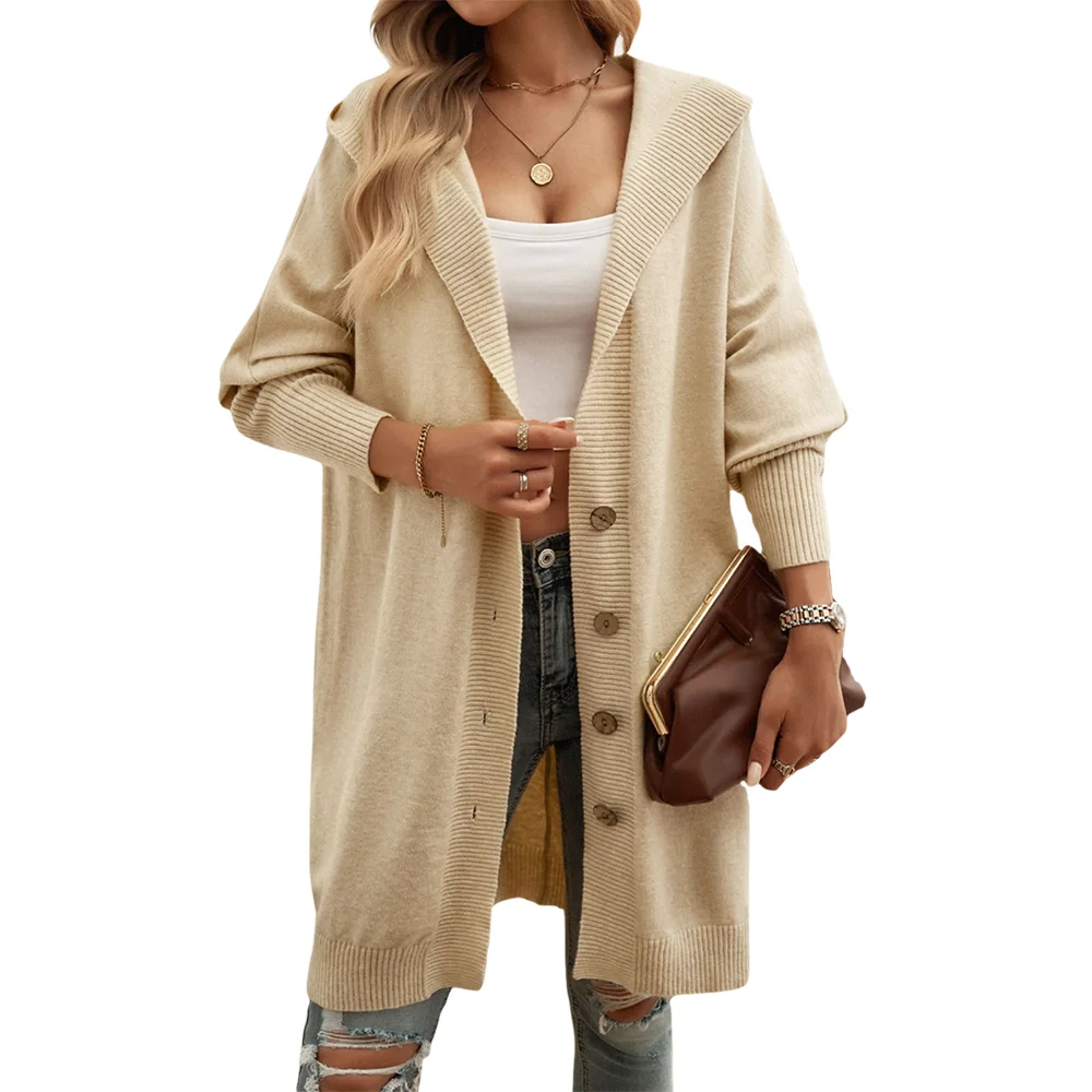 Customized Ladies Medium-Length Solid Color Hooded Cardigan Sweater Winter Casual Ribbed Knit Coat with Front Button Design